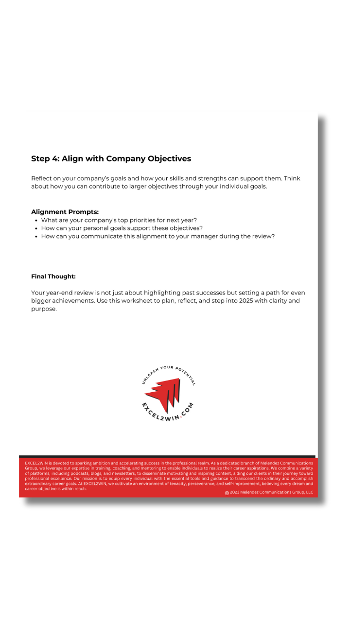 As a supplemental resource to the article "Preparing for the Year-End Review: How to Showcase Your Leadership Growth and Set New Goals" featured in the EXCEL2WIN Leadership Newsletter, the "Preparing for the Year-End Worksheet" is your roadmap to success. This free download is designed to help you reflect on your leadership achievements, gather constructive feedback, and set SMART goals for 2025. Packed with actionable steps and prompts, it aligns perfectly with the strategies outlined in the article, ensuring you walk into your year-end review prepared and confident. Whether you’re striving to amplify your leadership impact or align your goals with your company’s vision, this worksheet is the ultimate tool to drive your professional growth. Don’t miss out—download it today and start turning insights into action!